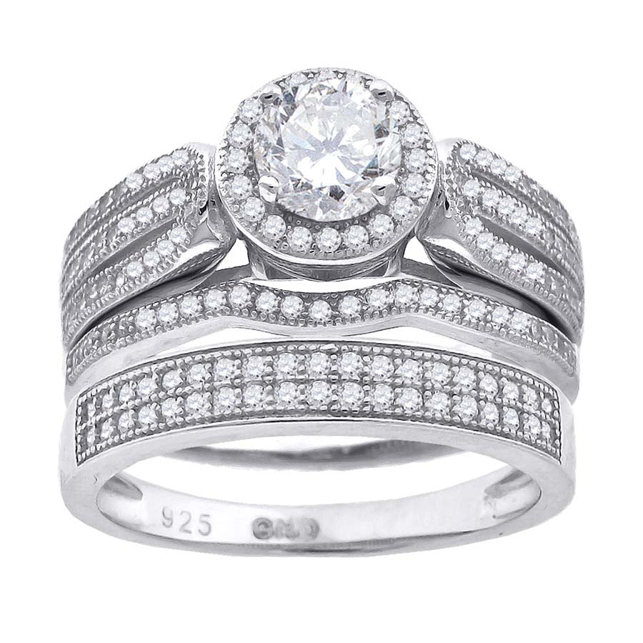 925 Sterling Silver His & Hers Cubic Zirconia Halo Trio Ring Set